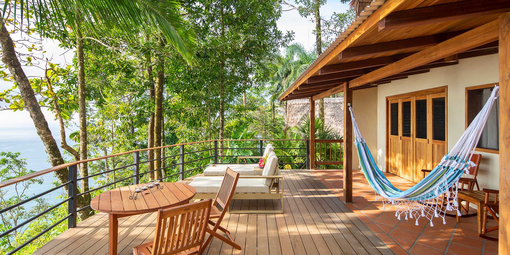 At the centre of the property, by the main lodge and restaurant, are 9 Deluxe Cabinas, Aracari Villa and La Orquidea. The cabinas are simple standalone huts with thatched roofs and fold-back doors onto a terrace with rocking chairs or sofas, hammocks and ocean views. There's a kingsize double bed, and a shower bathroom. Ylang has two double beds, while six others have a loft bedroom reached by ladder, with a double and a single bed - perfect for families. Aracari is a two-storey villa with three bedrooms (2 doubles, 1 twin) and two bathrooms, to suit a family; La Orquidea is a standalone raised casita with a large bedroom for 2-4, so suits either a couple or a family.