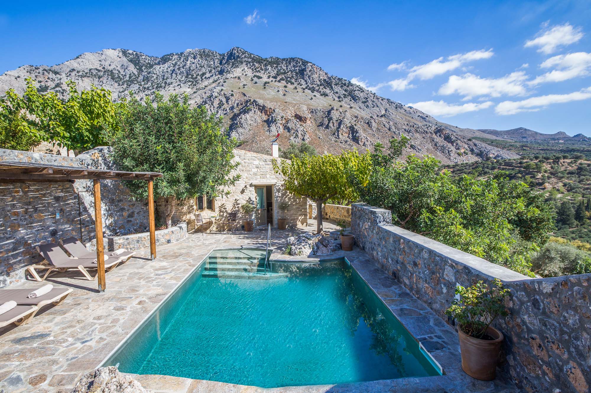 Eleonas, meaning 'olive grove' in Greek, is a collection of pastel-painted cottages, sprinkled amongst a wonderful fruit and olive estate in southern Crete. Set in a stunning location, against a backdrop of dramatic rocky peaks at the foot of Crete’s highest mountain, Psiloritis, it's close to the sleepy village of Zaros but still feels wonderfully remote.