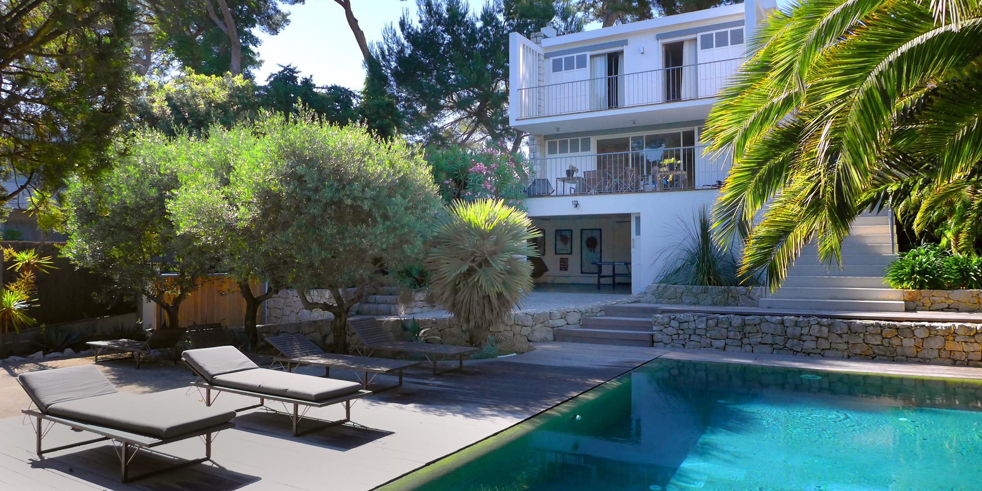 This simple 1960's modernist villa makes a great base. Set in a quiet leafy residential area, you can walk down to the boulangerie or up to the butcher; laze by the pool and top up your tan; potter off to Keller Beach Club or Le Rocher for lunch and a swim; or climb up the hill to the Cap’s totemic lighthouse for fine views east and west. Contemporary simplicity is the virtue within. Stylish rooms come in white, there are terraces galore, a decked pool shaded by palm trees and a practical kitchen with all the kit. Brilliant.