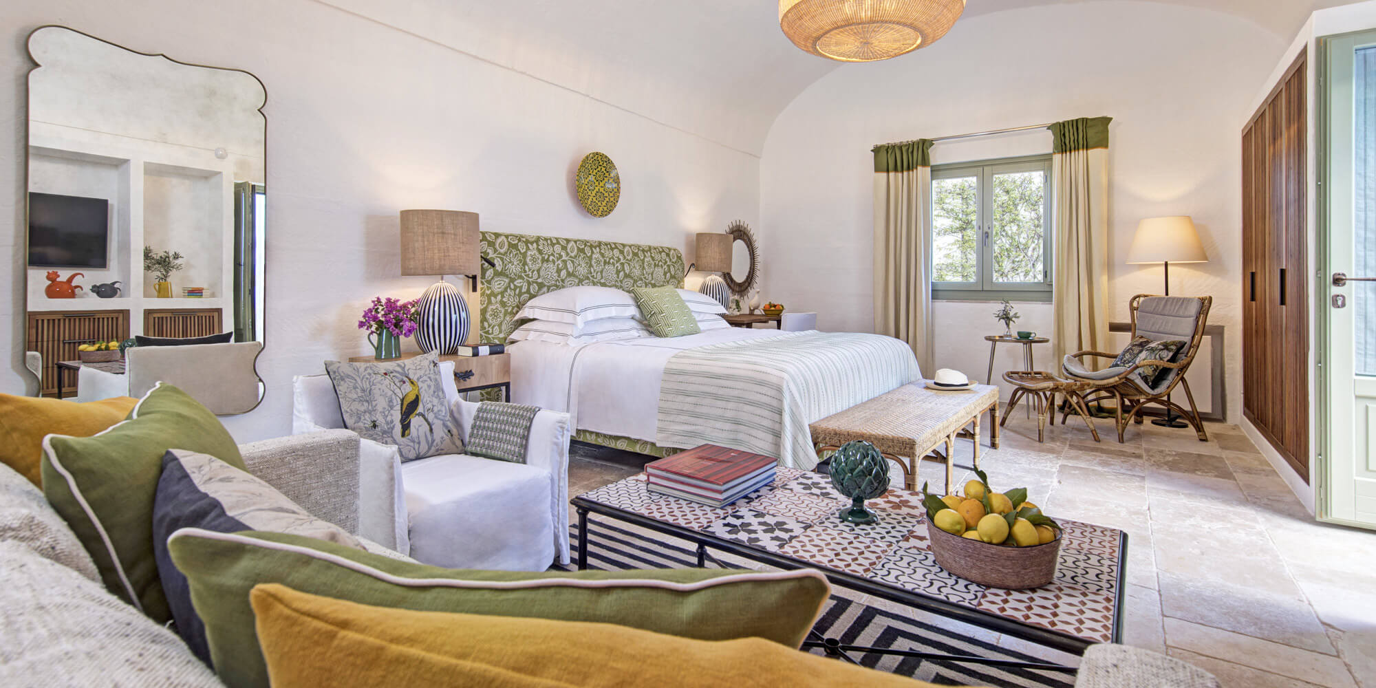 In new-built, whitewashed tufa outhouses with cathedral-arched ceilings, rooms share a design ethic of bone whites, duck egg green and pale mustard, creating a feeling of light, tranquillity and space. The flagstone floors are occasionally broken by woven woollen mats, set against wooden wardrobes and elegant extra-large beds. Local Puglian objects d'art and off-white fabrics give the country style a sophisticated twist.