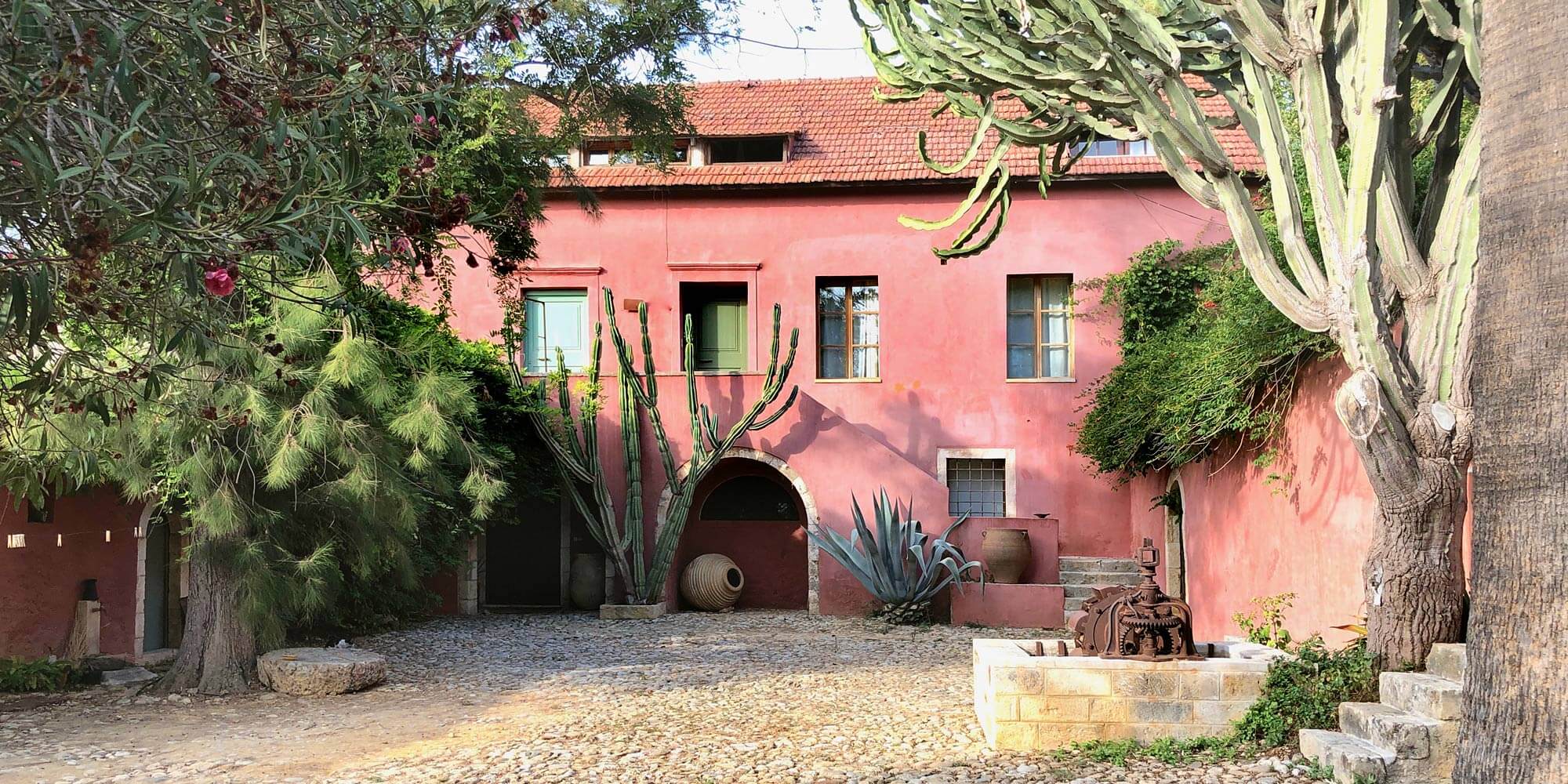 Set in a peaceful walled garden with towering palm trees, Metohi Kindelis lies just off the main road, 3km southwest of Chania, between the sea and the mountains in western Crete.