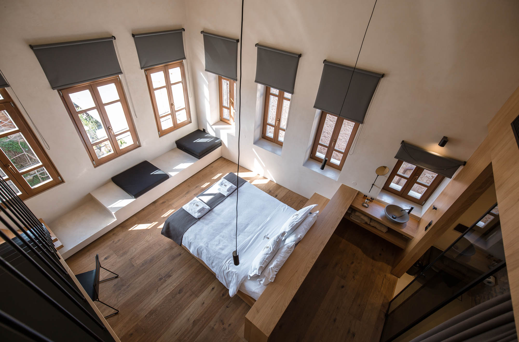 Set in the backstreets near the famous Venetian harbour in Chania, the Monastery Estate is a testament to the city's rich history. Originally a 16th-century mansion, this boutique hotel has undergone a startling restoration resulting in a marriage of elegant minimalism and historical authenticity. Crucially, the restoration has preserved the architectural treasures of old – the walled patio, stone-carved doors, arches, high ceilings, and the original Roman walls dating back to the 1st century, now housed under a stunning glass display. But the past has also given way to contemporary luxe – the 19 high-ceilinged suites are spacious and elegant with low cubic furniture, black metal tables, fulsome mattresses, and monogrammed towels and sheets.