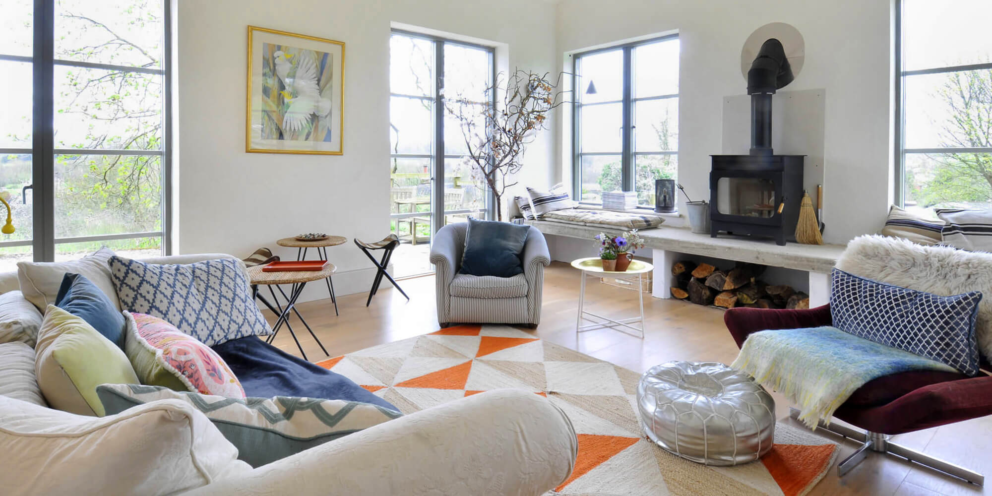 Stylewise, it's a stylish haven of boho-chic fabrics and antique furnishings. The original brick floor (now with underfloor heating), is softened by geometric rugs, while battered leather armchairs are made cosy with Moroccan cushions and Indian throws. Everywhere you look there's something of interest: a floor-to-ceiling dresser of mismatched crockery, vintage signs in the utility room, and a deep-blue hallway with rustic garden furniture and sprawling plants. Out in the garden, there are spots for sitting and dining whilst soaking in the views of the patchwork of green and golden fields. There's even a natural swimming pond for refreshing morning dips. And with lots of foodie pubs, charming villages, and iconic Stonehenge and Salisbury nearby, the Nadder Valley is the ideal backdrop to a quintessentially English holiday.
