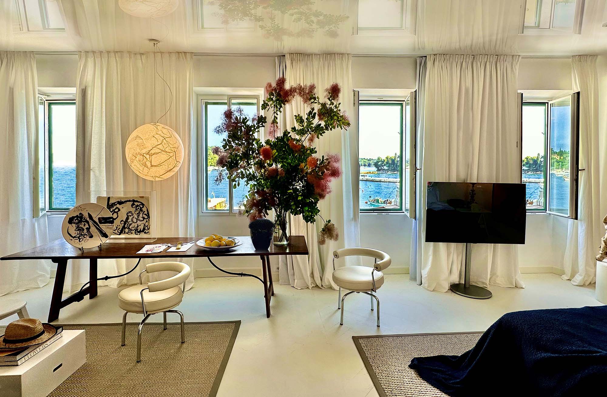The open-plan lounge-bedroom enjoys glorious views of the shimmering Adriatic merging into a celeste blue sky, with sweeping white curtains and window shutters should you want to sleep late. In the lounge area, you have white wooden floors, a sofa and armchair, a bar, and a long antique oak dining table with two white leather swivel chairs.
