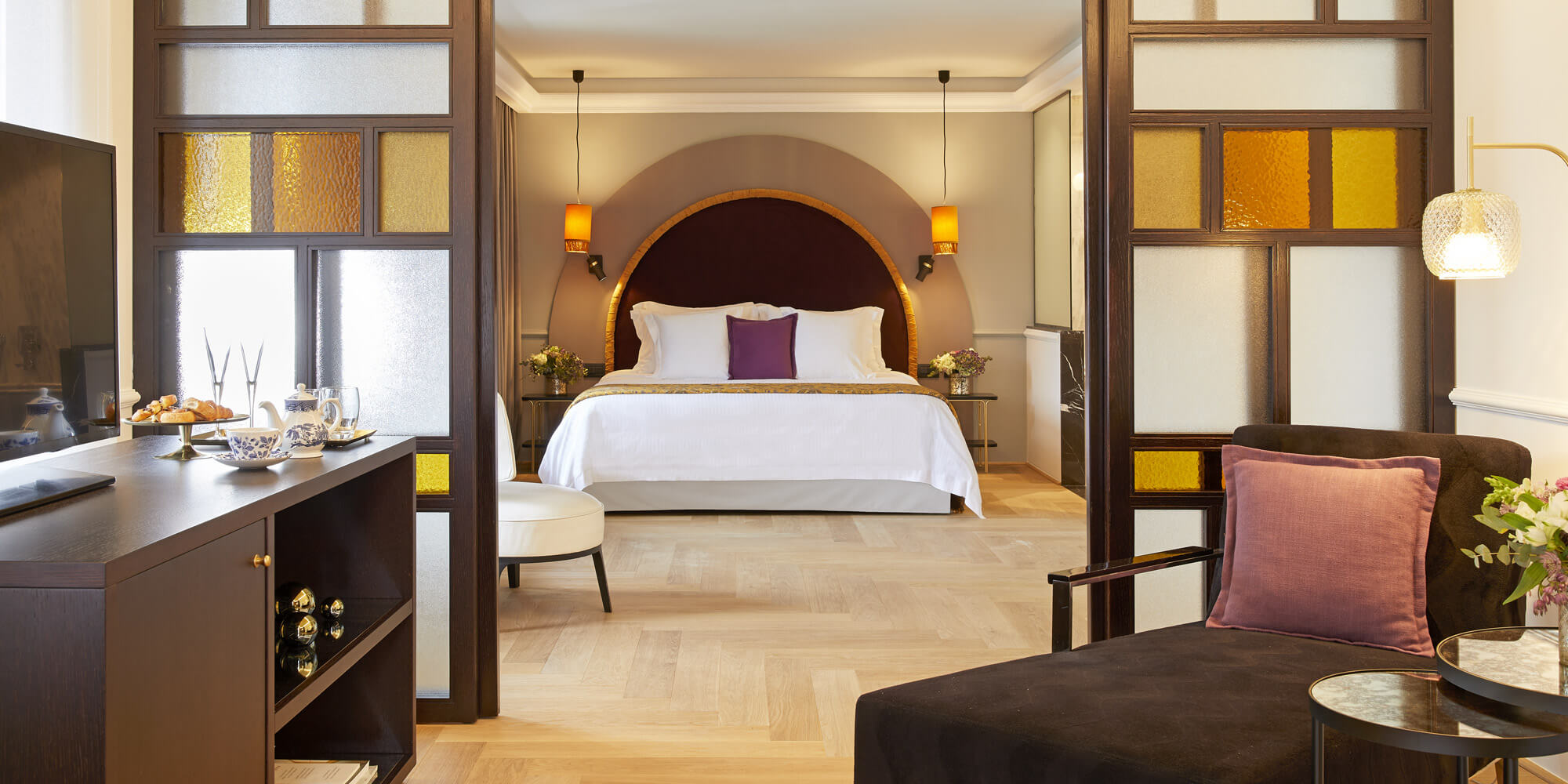 The 34 double rooms and suites are dressed in clean contemporary lines, with honey-coloured hardwood floors and spots of rich colour - plum, gold, persimmon - against white walls and linens. Interesting juxtapositions of textures and finishes include leather headboards, frosted globe lights, mirrored bedside tables, frosted closet doors and stunning gold panels that roll across windows to create total darkness and quiet for a great night's sleep. Even in the Classic Double and Deluxe Double rooms - where space is limited to 20 or 25sqm - the effect is comfortable elegance.