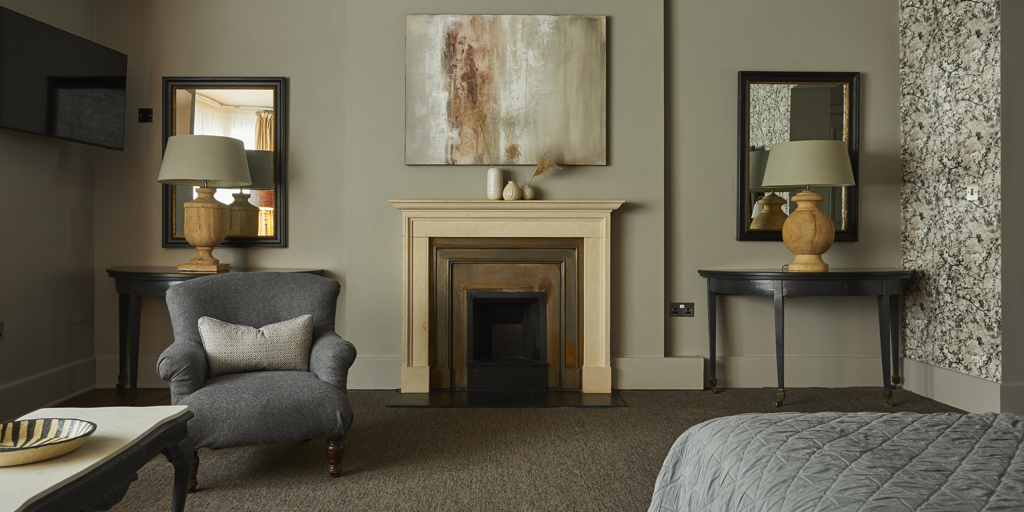 The 18 relaxing bedrooms are dressed in grey, green and stone shades, accented by soft wools, zig-zag fabrics, mosaic tiles, statement wallpaper and solid-wood dressers.