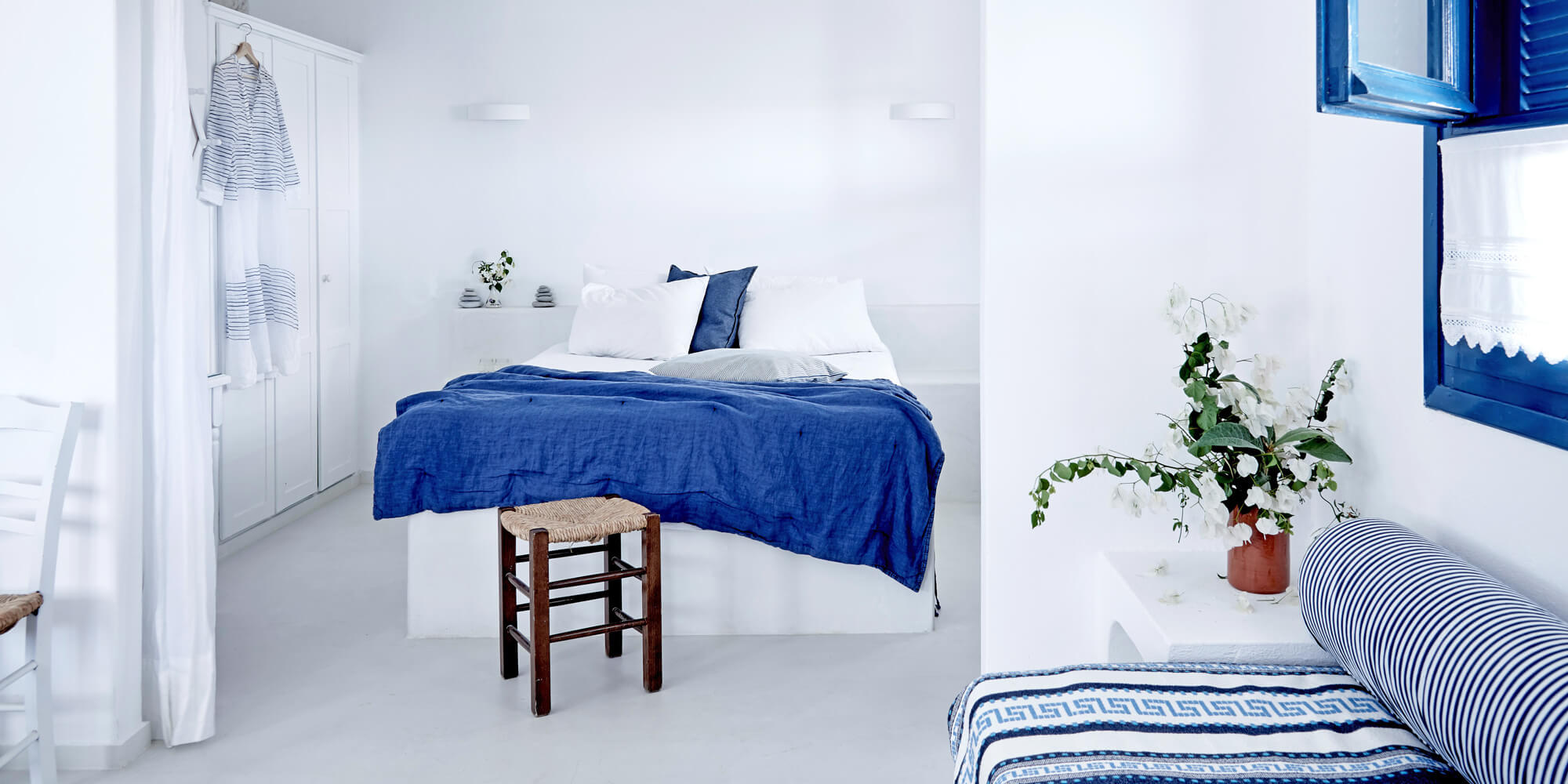 The other suites are more rustic, done in classic blue-white Cycladic style. Most are 1-Room Apartments, which have a double bedroom and a living room with built-in sofas that can be made into beds to sleep additional people. The 2-Room Apartments have a second twin bedroom. All have tiled floors (the nicest ones are terracotta), tiled bathrooms, Korres toiletries, hammocks on the terrace, whitewashed walls, and simple wooden furniture, some of which is whitewashed. Doors and shutters are Grecian blue, as are the sofa covers.