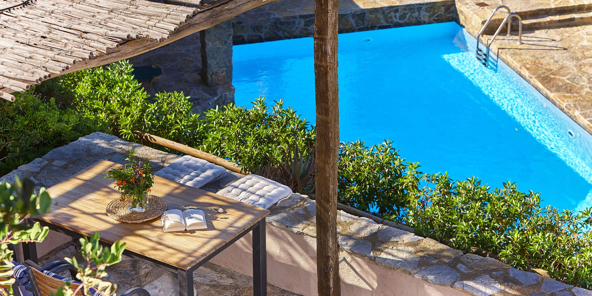 Aside from this, the houses are self-catering, with small, simply-equipped kitchens and a dining area. There’s a little electric cooker (2 rings, mini-oven and grill), a fridge (with ice tray – very important!), a kettle, toaster, basic tools (saucepans, corkscrew, grater, lemon-squeezer, knives) and enough cutlery and crockery for 2-4, depending on the house. There’s a table inside, but chances are you’ll be eating outside on the private terrace – each house has one, but some are prettier than others.